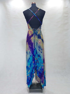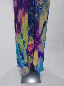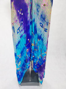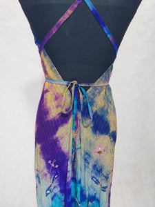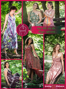Dieses Magische Kleid wurde aus indischen Second-Hand-Chiffon-Seiden-Sarees genäht und ist somit ein Unikat. Durch den besonderen Schnitt des Magischen Kleides und die vielen verschiedenen Bindemöglichkeiten, passt sich das Kleid nahezu jeder Körperform und Konfektionsgröße an.